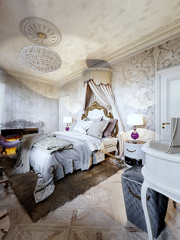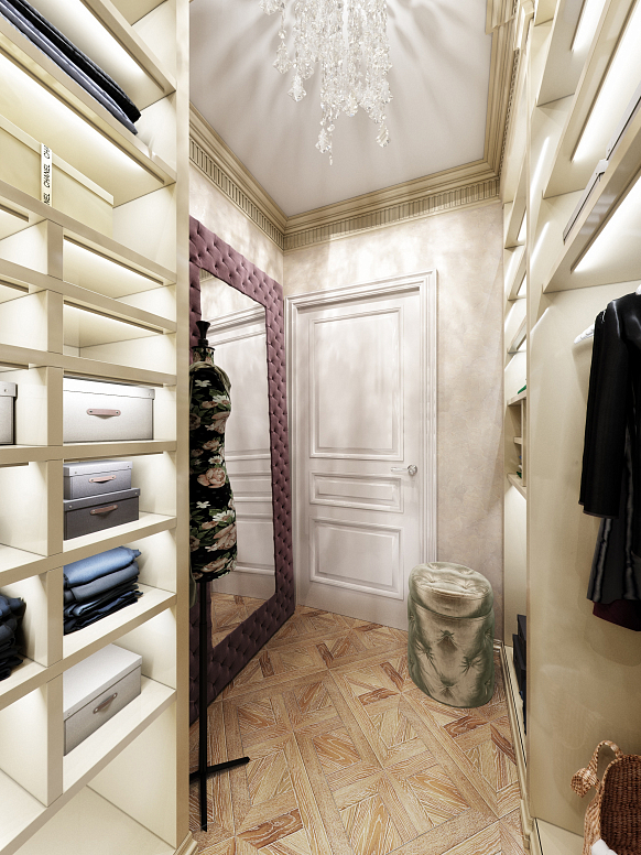Использование лепнины и розеточных форм в декоре потолка - традиционный прием в классических интерьерах. Пол облицован мраморными плитами разных пород. Люстры ручной работы из муранского стекла и богемского хрусталя. Роскошное убранство подразумевает и высокий уровень комфорта, поэтому квартира оборудована системой "умный дом".